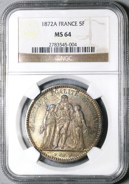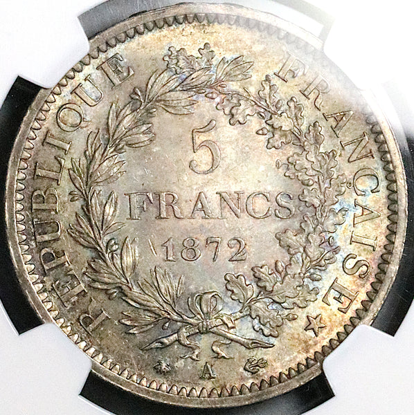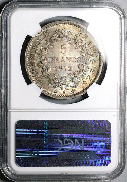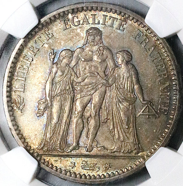 - Gem Mint State Uncirculated France 3rd Republic silver 5 francs coin.