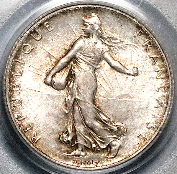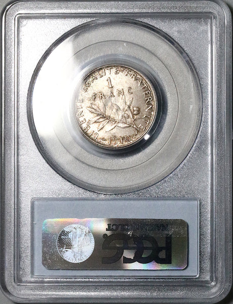 - Gem Mint State Uncirculated France silver 1 franc Sower or Semeuse type coin.