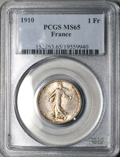 1910 PCGS MS 65 France 1 Franc Sower Mint State Paris Gem Silver Coin (26011101C)