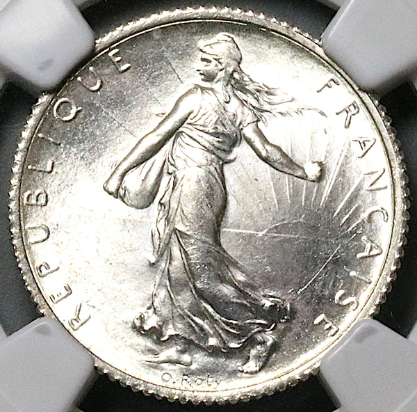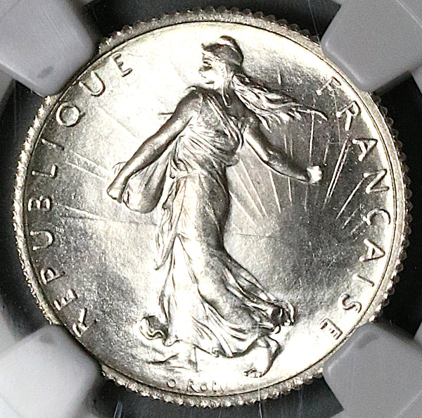 - Gem Mint State Uncirculated France silver 1 franc Sower or Semeuse type coin.