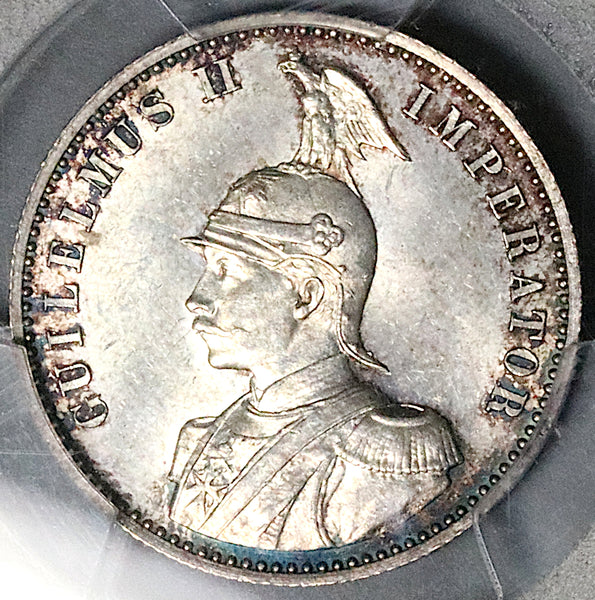 - Gem Mint State Uncirculated German East Africa silver 1/2 rupie coin.