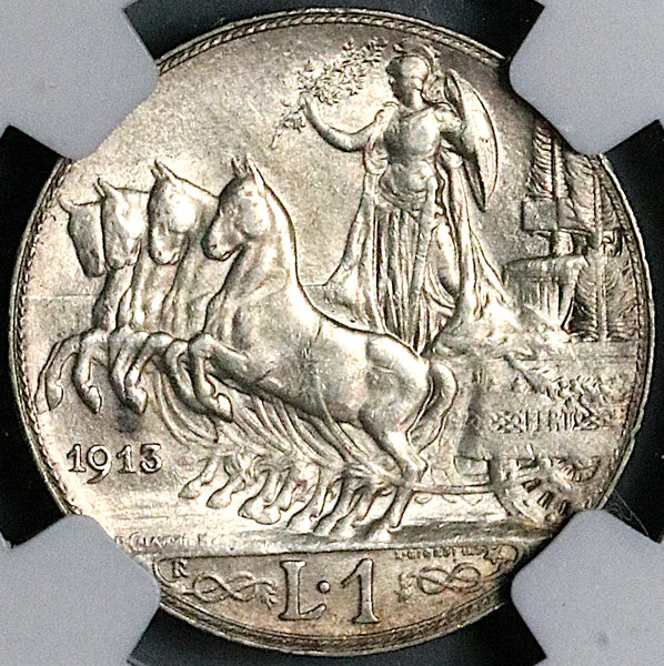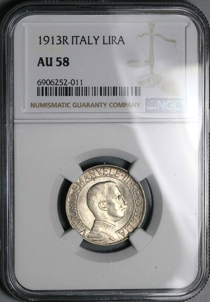1913 NGC AU 58 Italy 1 Lira Horses Chariot Rome Mint Silver Coin (24101202C)