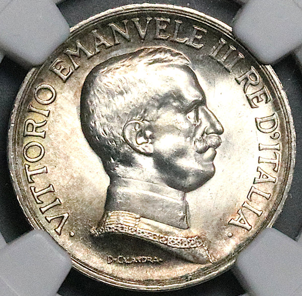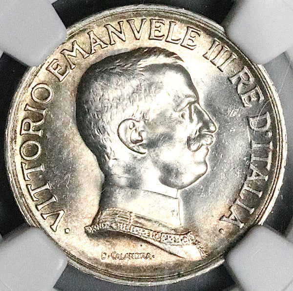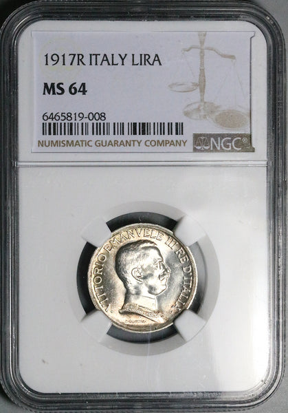 1917 NGC MS 64 Italy 1 Lira Horses Chariot Mint State Silver Coin (25121802C)