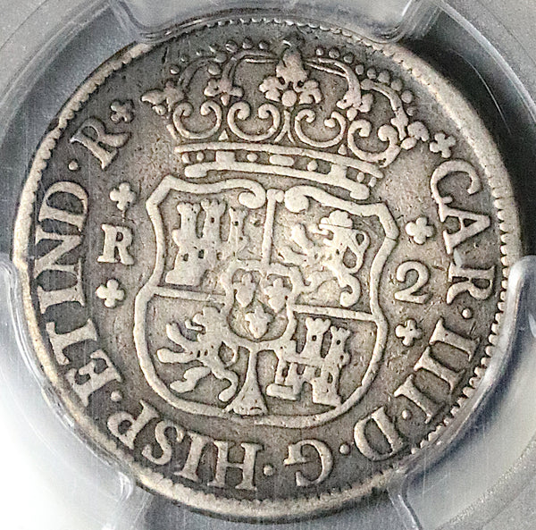 1764 PCGS F Mexico 2 Reales Charles III Pillars Globes Silver Coin (25082202C)