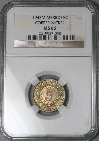 1942 NGC MS 66 Mexico 5 Centavos Aztec Sun Stone Copper Nickel Coin (25112204C)