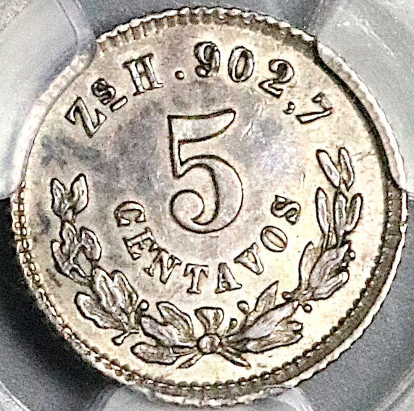 Almost Uncirculated Mexico silver 5 centavos coin.