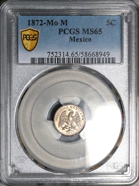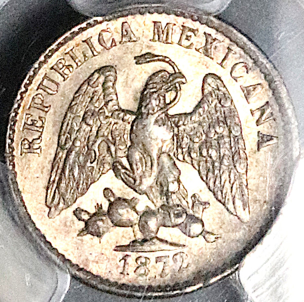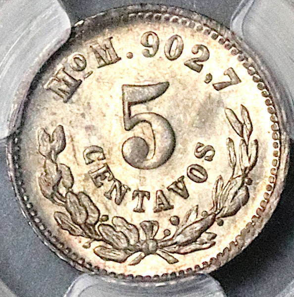- Gem Mint State Uncirculated Mexico silver 5 centavos coin.