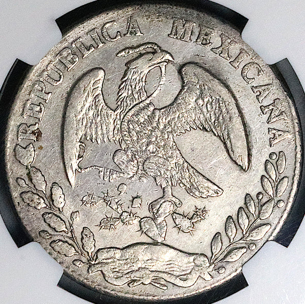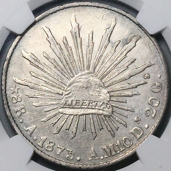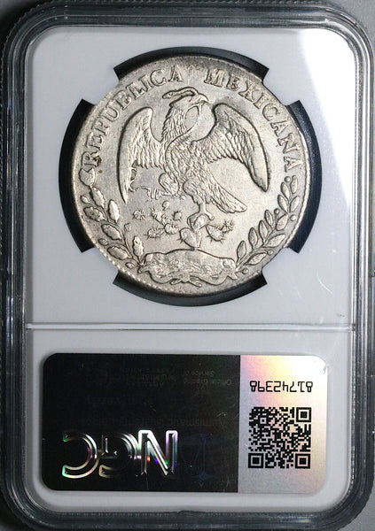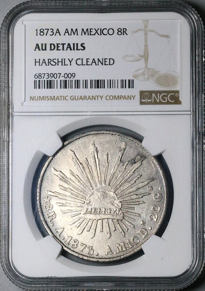 - Almost Uncirculated Mexico silver 8 reales coin.