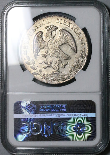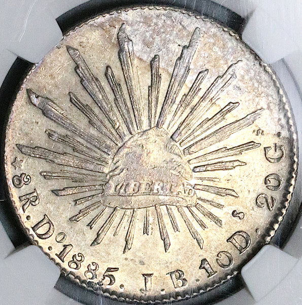 - Mint State Uncirculated Mexico silver 8 reales coin.