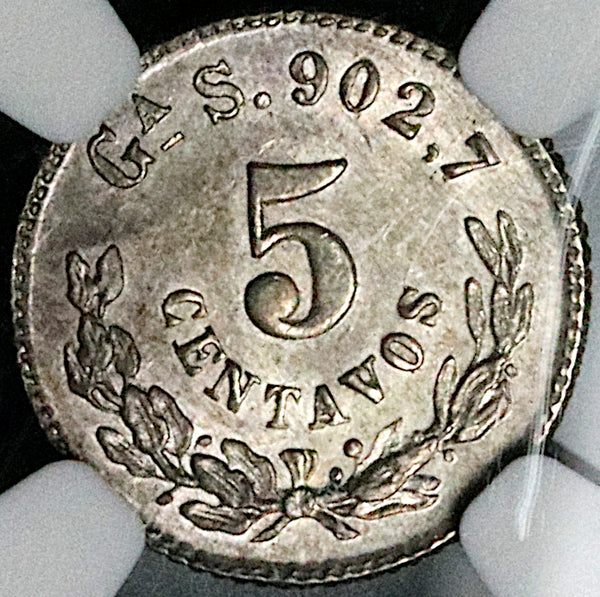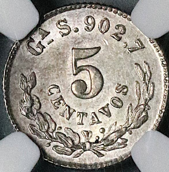 - Almost Uncirculated Mexico silver 5 centavos coin.