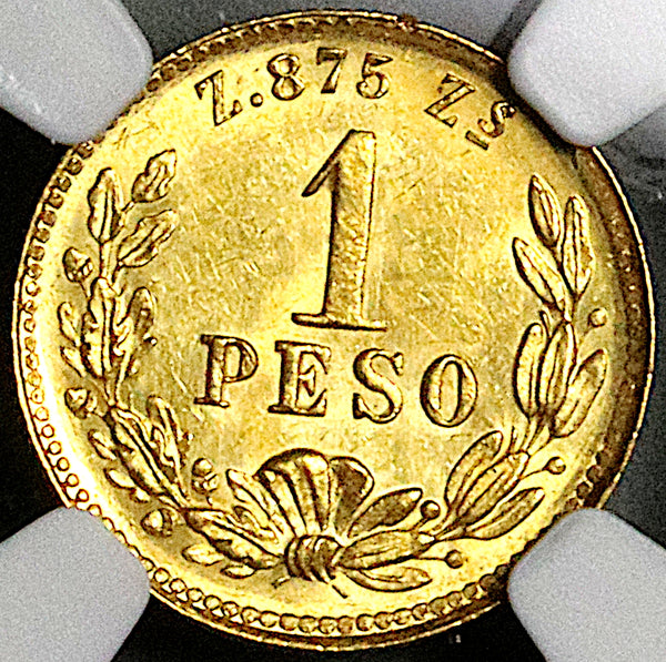 Mint State Uncirculated Mexico gold 1 peso coin.