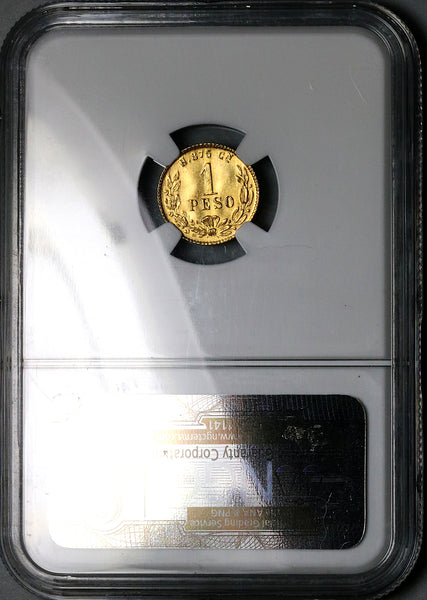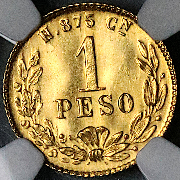 Mint State Uncirculated Mexico Gold 1 peso coin.