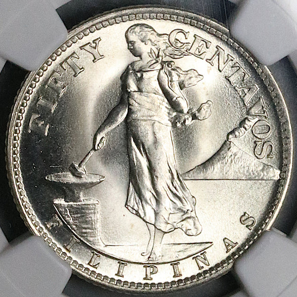 Gem Mint State Uncirculated Philippines 50 centavos US administration silver coin.
