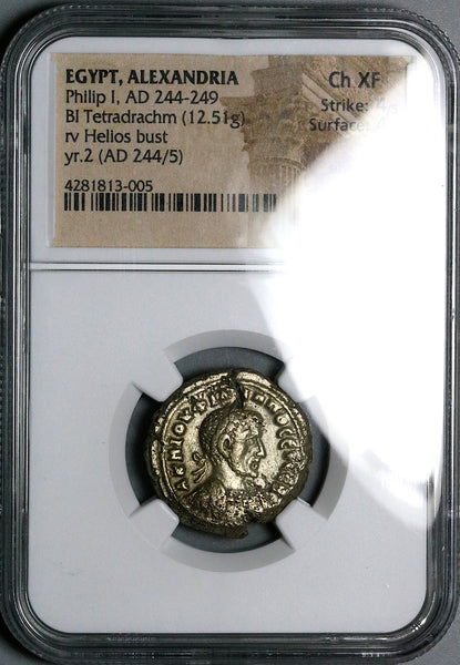 244 NGC Ch XF Egypt Alexandria Philip I Tetradrachm Sol Bust Rare Silvering (25112802C)