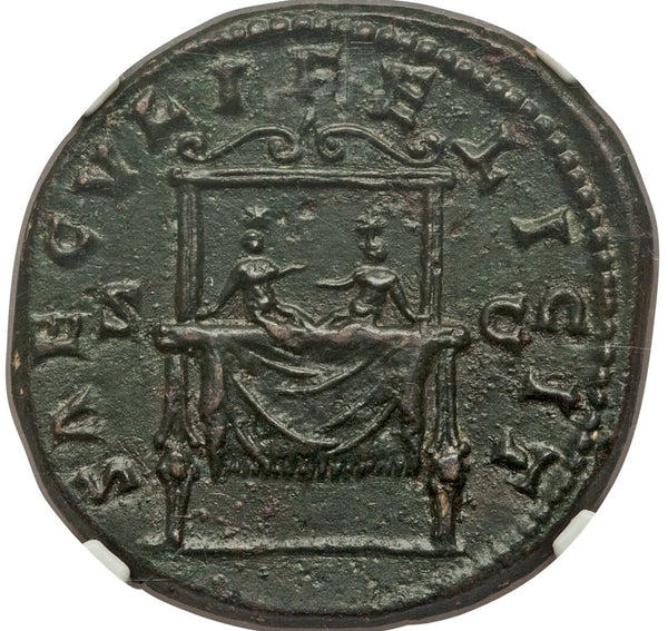 - Reverse: SAECVLI FELICIT S C, draped pulvinar (throne) upon which the twins, Commodus and Antoninus as babies, are seated.