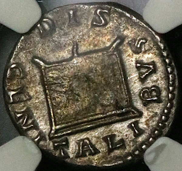 • Reverse: DIS GENITALIBVS, square lighted and garlanded altar.