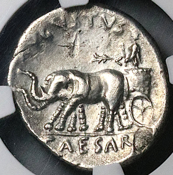 - Reverse: Augustus standing in biga of elephants, left, holding laurel branch in right hand and sceptre in left, AVGVSTVS CAESAR.
