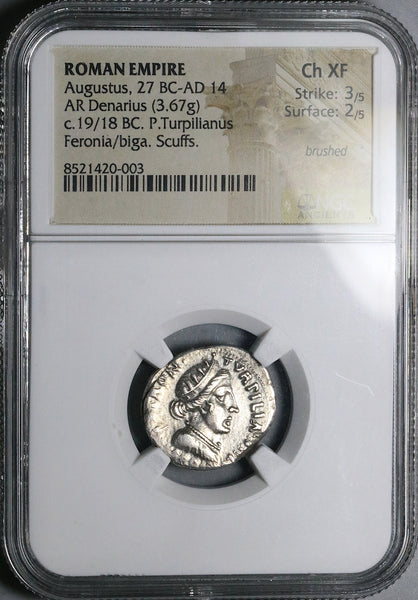 - Obverse: draped bust of Feronia right, wearing necklace and mural stephane, P PETRON TVRPILIAN IIIVIR FERO.