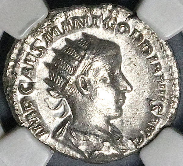 • Obverse: IMP CAES M ANT GORDIANVS AVG, radiate, draped, cuirassed bust facing right.