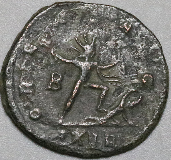 - Reverse: ORIENS AVG, Sol, radiate Sol advancing to right, holding olive branch and bow, trampling captive collapsing to right, head reverted, raising a protective arm; B in left field, XXIR in exergue.