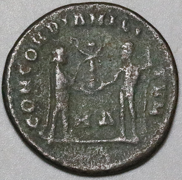 - Reverse: CONCORDIA MILITVM, Diocletian, draped, cuirassed, standing right, receiving small Victory on globe from Jupiter, Jupiter standing left, leaning on sceptre with left hand.