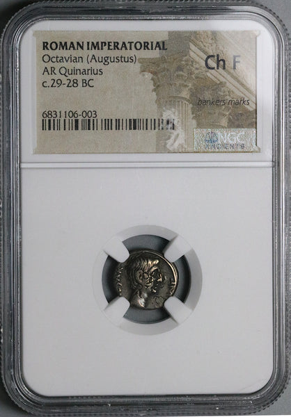 - Commemorative issue struck for Augustus (Octavian) cira 30 BC (NGC attributes to 29-28 BC).