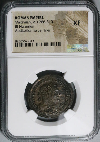 305 NGC XF Maximian Abdication Follis Roman Empire Providentia Trier Mint (25020101C)