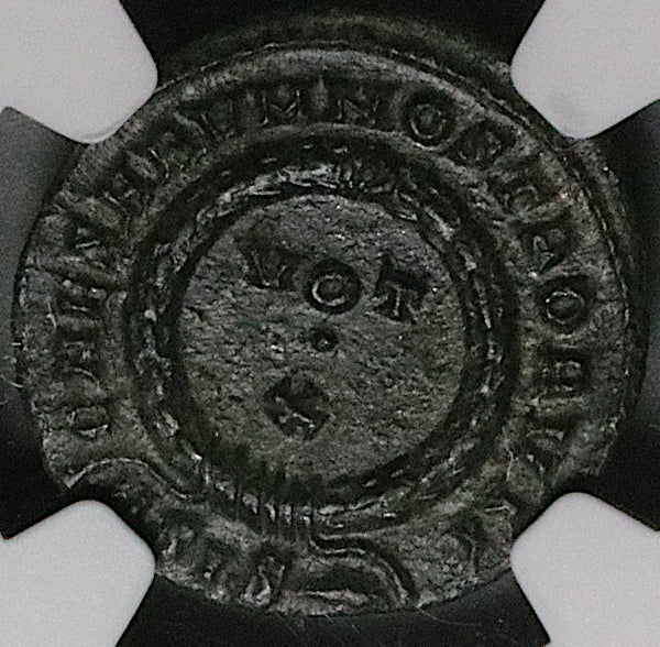 - Reverse: CAESARVM NOSTRORVM around VOT X in wreath, in ex mintmark, ASIS radiate semicircle.