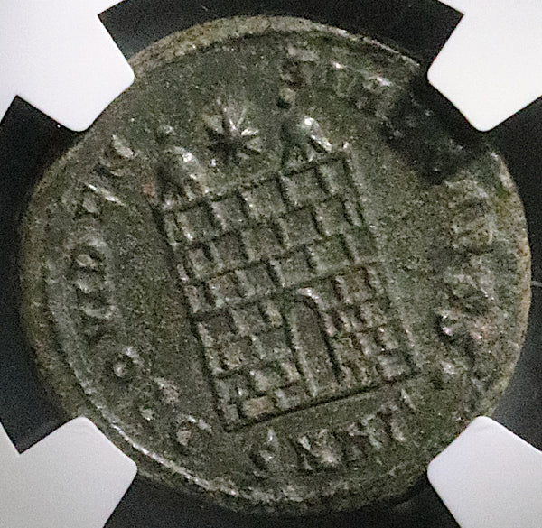 • Reverse: PROVIDENTIAE CAESS, camp gate with two turrets; star above, SMHΓ dot in exergue.