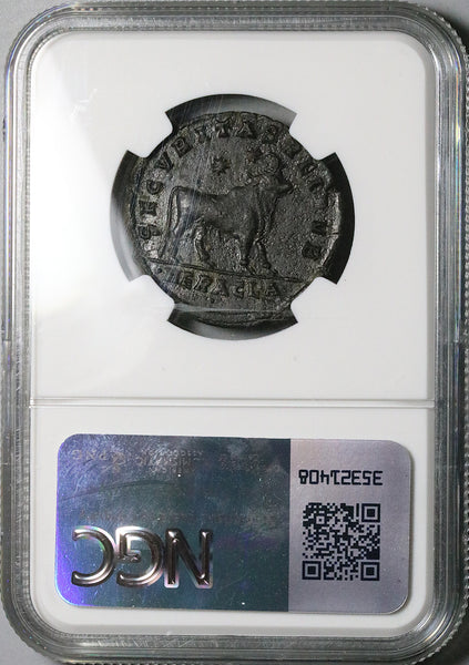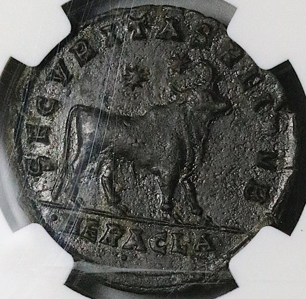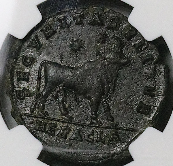 - Reverse: SECVRITAS REI PVB, in ex HERACLA dots flanking mint mark and one dot below, bull standing right with two stars above.