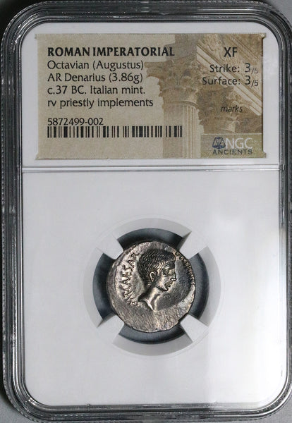 37 BC NGC XF Octavian Roman Imperatorial Denarius Priestly Implements (25051901D)