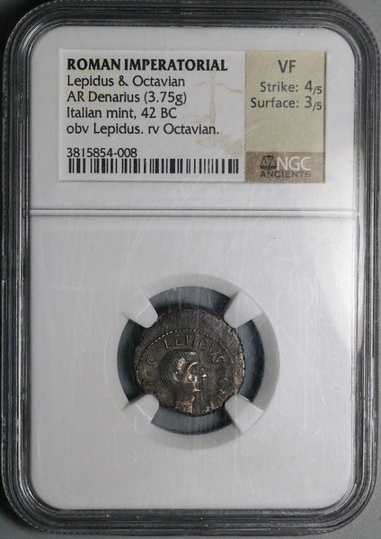 - Rare type minted by Lepidus (as Imperator and Triumvir) to celebrate the Second Triumvirate with colleague Octavian (Augustus), nephew of Julius Caesar.