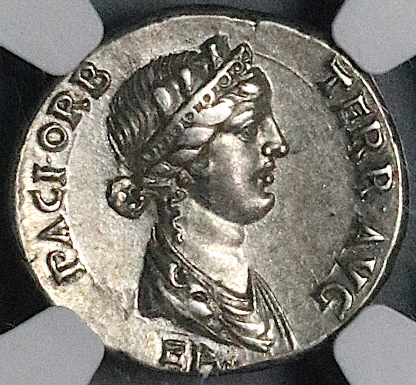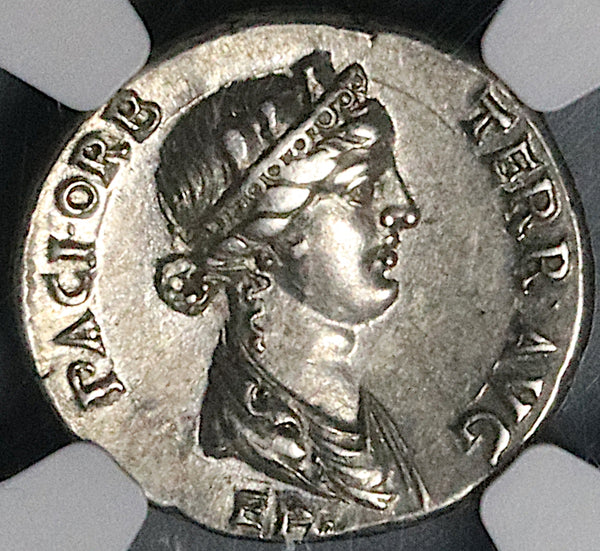 • Reverse: PACI ORV TERR AVG, below Pax E PHE, Bust of Pax draped and towered facing right (deity bust types seldom used on denarii).
