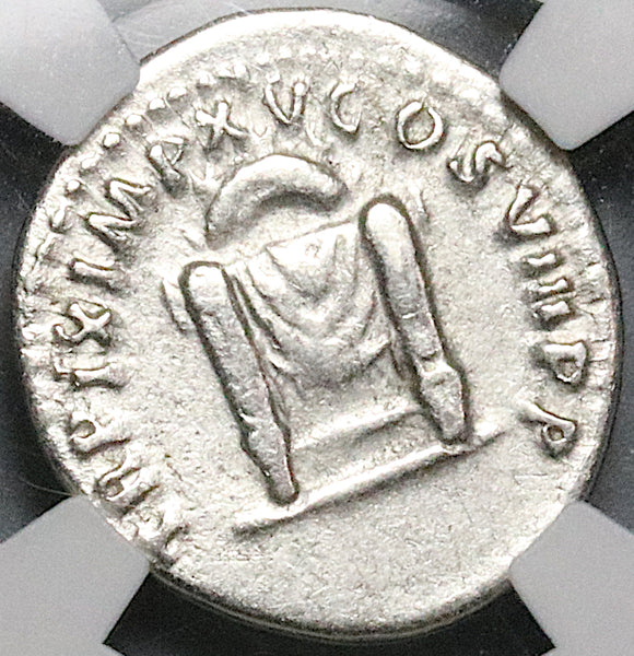 Reverse: Throne with semi-circular back, decorated with three palmettes, TR P IX IMP XV COS VIII P P.