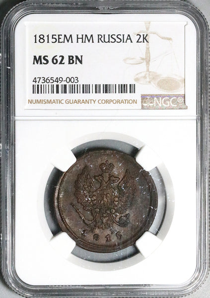 1815-EM HM NGC MS 62 Russia 2 Kopeks Alexander I Copper Coin POP 5/4 (26011001C)