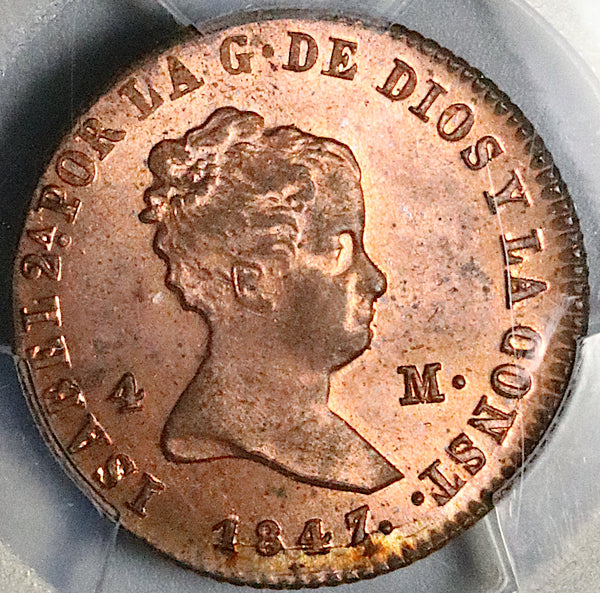 1847-JA PCGS MS 63 RB Spain 4 Maravedis Isabel 2 Jubia Mint Copper Coin (24092401D)