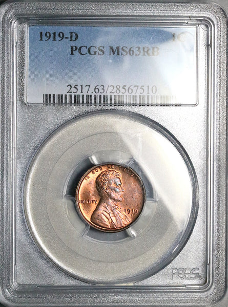 1919-D PCGS MS 63 RB Lincoln Wheat Cent Denver Penny Coin (25121605D)