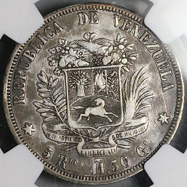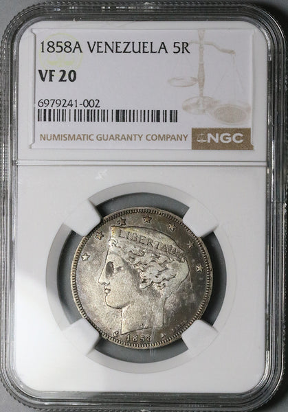 1858-A NGC VF 20 Venezuela 5 Reales Rare Paris Mint 1 Year Silver Coin (25102201C)