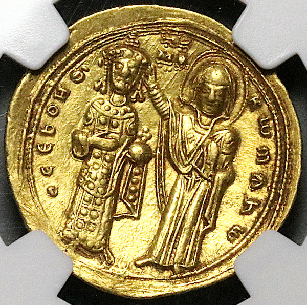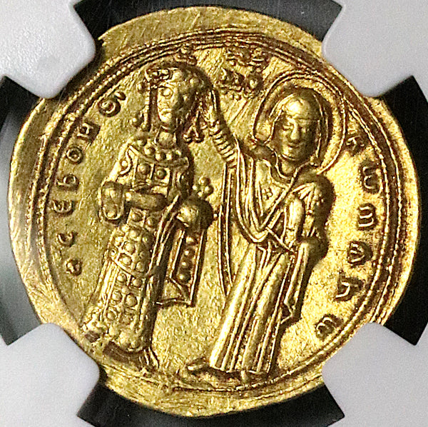 Reverse: ΘCЄ bOHΘ'-RwmAhw, standing facing figures of Romanus III (on left), bearded, wearing crown with pendilia, saccos and loros, four pellets on sleeve, globus cruciger in left hand, and the Virgin (on right), nimbate, wearing pallium and maphorium, crowning emperor with right hand; decorative element over MΘ in central field between their heads, double border. .
