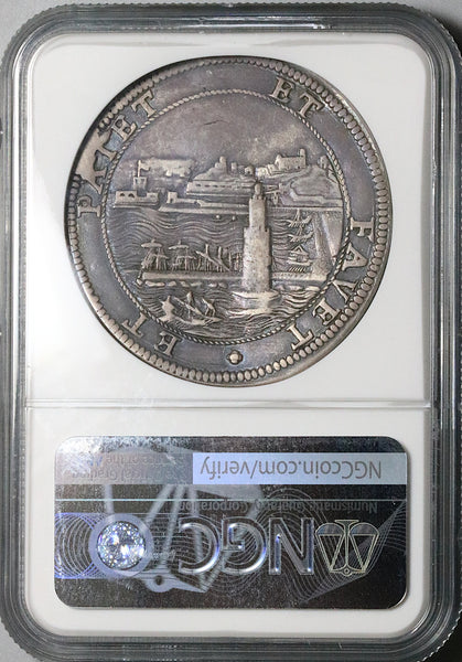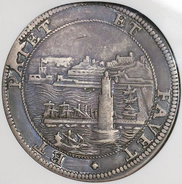 - Reverse: harbor scene depicting light house, piers, harbor equipment, ships (galley with oars), fort, etc.