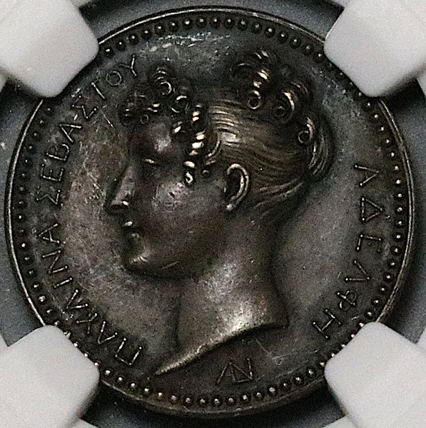 - Obverse: Head of Princess Pauline left: ΠΑΥΛΙΝΑ ΣΕΒΑΣΤΟΥ ΑΔΕΛΦΗ (Paulina Sevasti Sister), AN (Andrieu) monogram below.