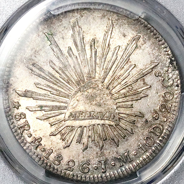 Almost Uncirculated Mexico First Republic silver 8 reales coin.