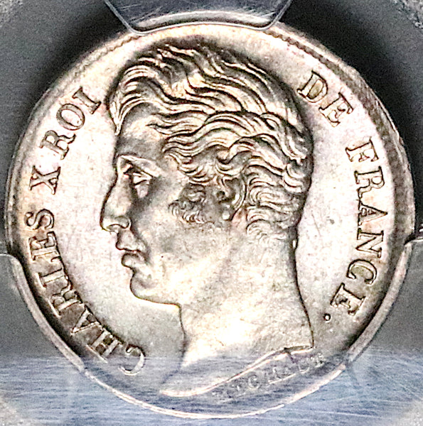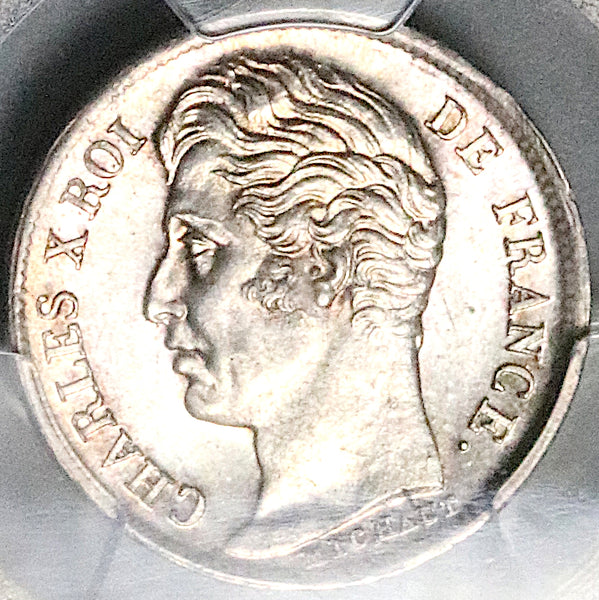 - Struck for Charles X at the Lille Mint (W mintmark), cardecus privy mark.