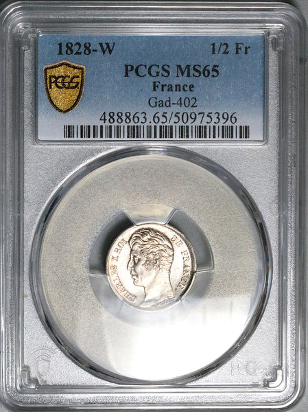 1828-W PCGS MS 65 France 1/2 Franc Charles X GEM Lille Silver Coin POP 2/0 (26020504C)