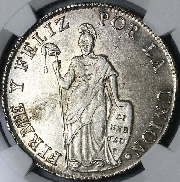 Almost Uncirculated Peru silver 8 reales standing liberty coin.