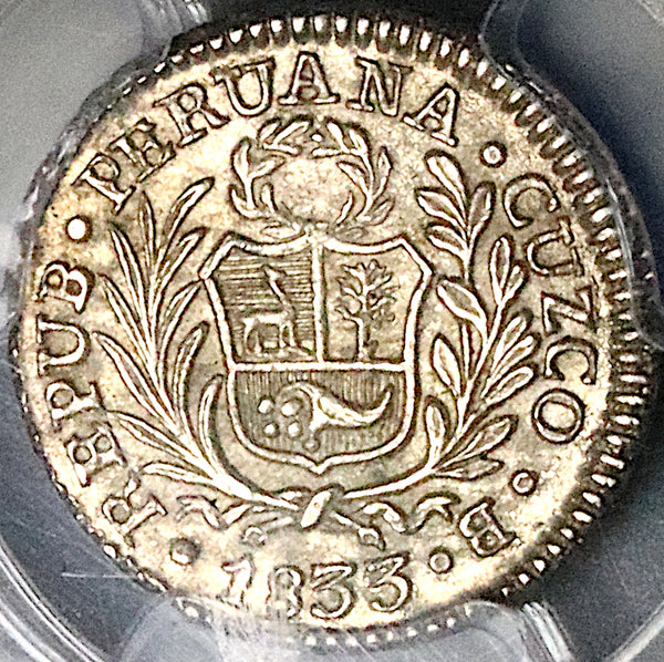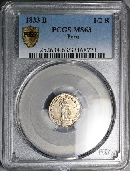 1833 PCGS MS 63 Peru Cuzco 1/2 Real Standing Liberty Coin POP 1/0 (23120301D)