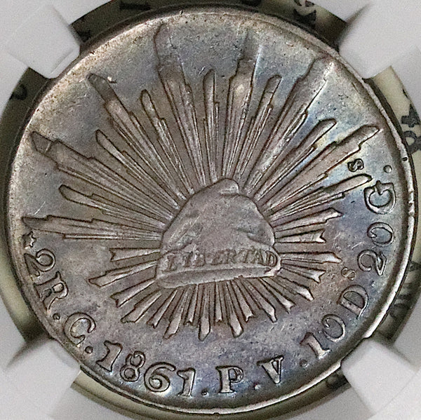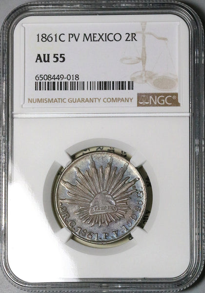 1861-C NGC AU 55 Mexico 2 Reales Culiacan Cap Rays Silver Coin POP 1/3 (23080602C)