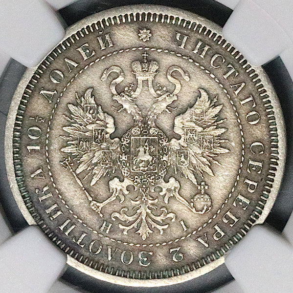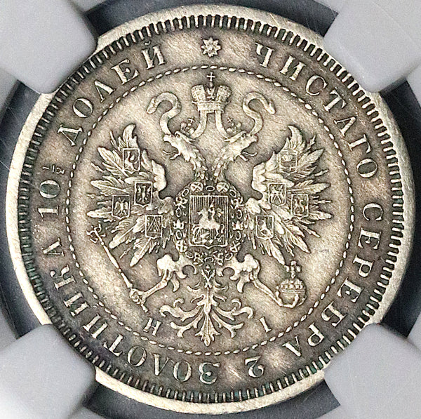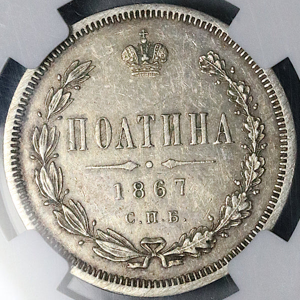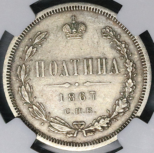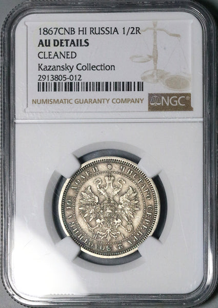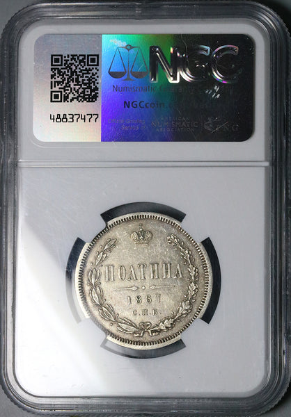 1867 NGC AU Russia Poltina 1/2 Rouble 26k Alexander II Czar Silver Coin (25122005C)