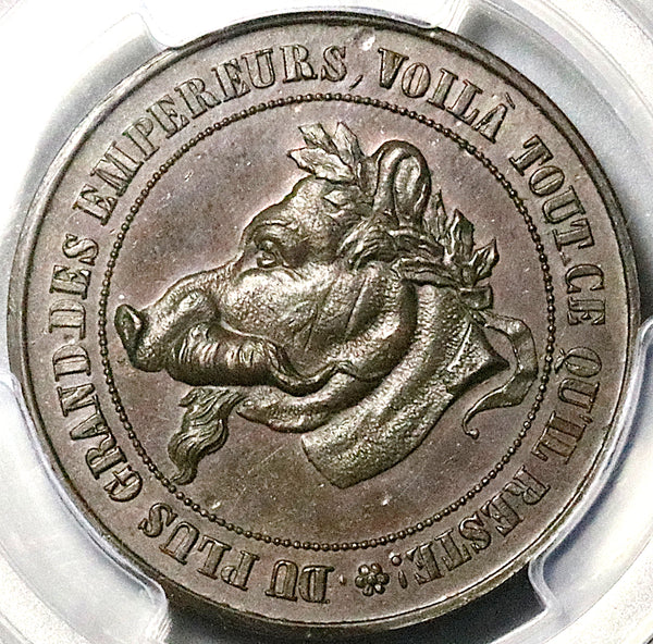 • Obverse: DU PLUS GRAND DES EMPEREURS, VOILA TOUT CE QU'IL RESTE, laureate pig head with beard and moustache of Napoleon III left.