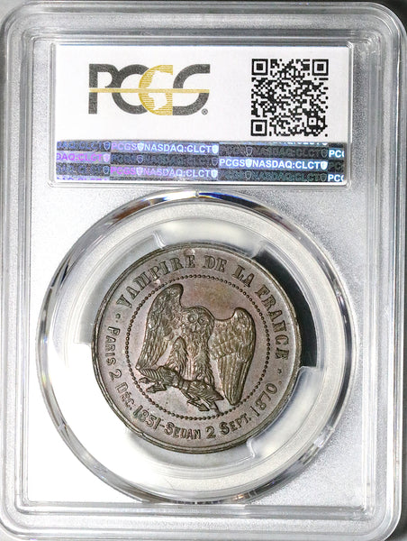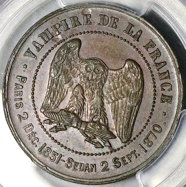 • Reverse: * VAMPIRE DE LA FRANCE * / PARIS 2 DEC. 1851 - SEDAN 2 SEPT. 1870. Owl (instead of the Imperial eagle) standing facing on lighting bundle.